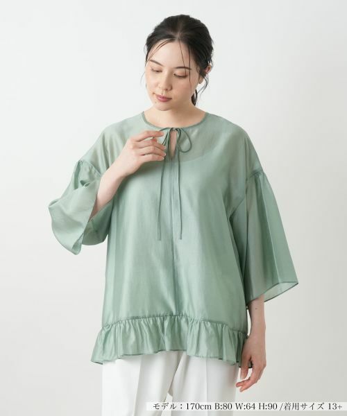 ふわりと広がるペプラムシルエットが、着こなしをぐっと華やかに見せてくれるブラウス。胸元のリボンと風をはらむボリュームスリーブも女性らしい甘さを演出。透け感のある生地は見た目にも軽やかで、初秋にかけてのスイッチシーズンに最適。インナーとのレイヤードで様々な表情をお楽しみいただけます。ボトムスは、すっきりとしたテーパードパンツやタイトスカートを合わせるのがおすすめ。ご自宅で手洗いできる手軽さも嬉しい、ワードローブの頼れる一枚です。