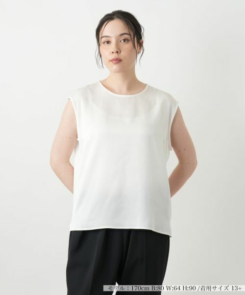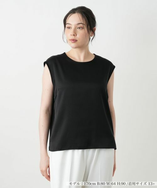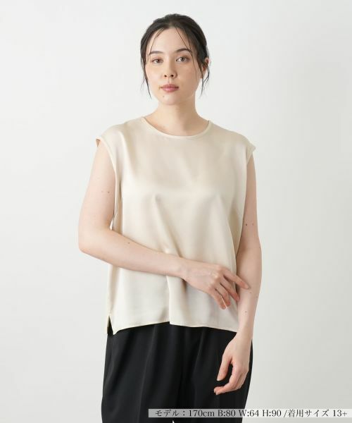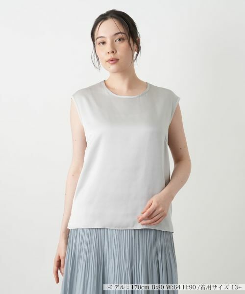 上品な光沢感が魅力のサテン素材で仕立てたノースリーブブラウス。無駄のないミニマルなデザインが、素材の上質さを一層引き立てます。肩のラインをきれいに見せるカッティングと、抜け感を演出するサイドスリットがさりげないポイント。オンオフ問わず、シーズンレスで活躍する着回し力の高さも魅力です。一枚で着ても様になり、ジャケットやカーディガンのインナーとして合わせれば、コーディネートにリュクスな輝きをプラスします。