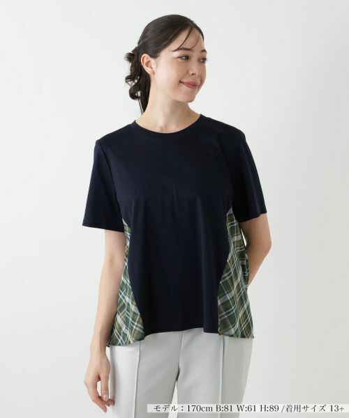ベースをシンプルなカラーで抑えつつ、サイドからバックにかけてトラッドなチェック柄の異素材で大胆に切り替えたカットソー。ふわりと広がるAラインシルエットがリラクシーな雰囲気。気になるヒップラインを優しくカバーしながら、こなれたバックスタイルを叶えます。フロントは伸縮性のあるカットソー生地で快適な着心地を実現します。シンプルなパンツと合わせるだけでコーディネートが様になる、頼れるアイテム。ご自宅で手洗いできる手軽さも魅力です。