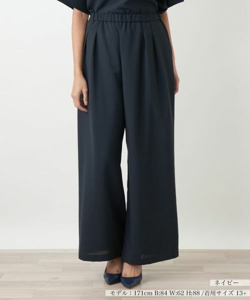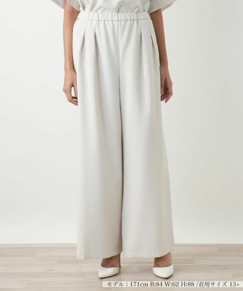 レッグラインをカバーしつつも、足元をすらりと長く見せるワイドシルエットのパンツ。ウエストは全面ゴム仕様で、リラックス感のある穿き心地ながら、トップスをインしても美しいウエストラインをキープ。両サイドには便利なポケットも配しています。同素材のトップスと合わせれば、旬のセットアップスタイルが完成。洗練されたワントーンコーデはオフィスシーンからカジュアルなお出かけまで、幅広いシーンで活躍してくれそうです。ご自宅で手洗い可能なのでお手入れも簡単。