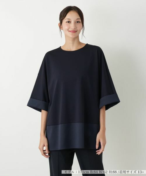 初秋のスタイリングを格上げする、切り替えデザインのチュニックカットソー。ゆったりとしたドロップショルダーと優雅なキモノスリーブが、リラックス感とモダンな雰囲気を両立。織地にも伸縮性があるため、ストレスフリーな着心地を実現します。シックなトーンでまとめられたカラーブロックは、合わせるボトムスを選ばず着回し力抜群。気になるヒップラインを優しくカバーするチュニック丈で、細身のパンツやレギンスとの相性も抜群です。