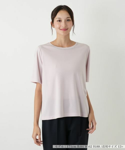 初秋のスタイリングにさりげない輝きを添えるカットソー。シンプルなデザインながら、前身頃の首元にあしらわれた繊細なホットフィットが、顔周りを華やかに演出します。肌触りの良い滑らかな素材で心地よい着用感を実現しました。薄手なのでジャケットやカーディガンのインナーとしてももたつかず、すっきりと着こなせます。程よく開いたネックはデコルテを美しく見せつつ、上品な印象をキープ。デイリーユースから、オフィス、ちょっとしたお出かけまで、幅広いシーンで活躍します。