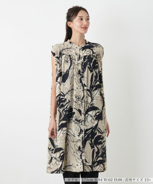 アートを思わせるフラワー柄のプリントが施された、バンドカラータイプです。大胆なタッチで描かれたフラワーモチーフが、着こなしにモードな個性をプラス。首元をすっきりと見せるバンドカラーは、上品でモダンな印象を与えます。薄手で軽やかな生地は程よい抜け感を演出し、涼やかな着心地をキープ。ゆったりとしたAラインシルエットで締め付け感がなく、リラックスして着用いただけます。チュニック丈なので、気になるヒップラインを優しくカバーし、細身のパンツやレギンスとの相性も抜群です。