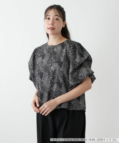 繊細な小花柄プリントが上品でやさしい印象を与えるブラウス。ふんわりとしたスリーブがさりげなく華やぎを添えつつ、肩まわりや腕のラインを自然にカバー。首元はシンプルなクルーネックで、顔まわりをすっきりと見せてくれます。落ち着いた色調のプリントなので柄物でも取り入れやすく、ボトムを選ばず活躍。ご自宅で手洗いできるウォッシャブル仕様で、デイリー使いにもぴったりな一枚。初秋の軽やかな着こなしにおすすめです。