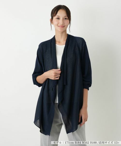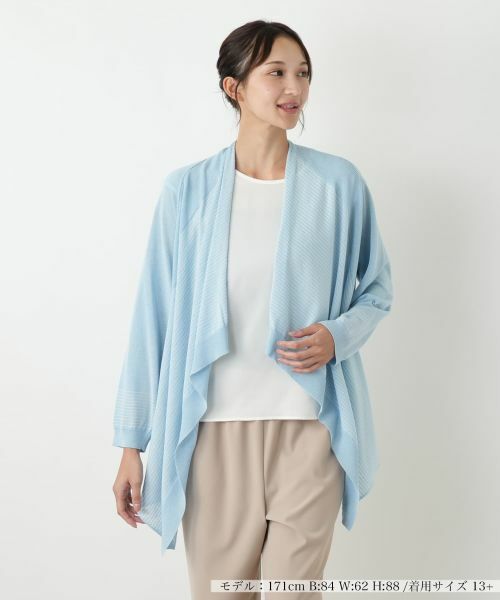 前身頃が優雅に流れるイレギュラーヘムのカーディガン。動くたびにふわりと揺れ、女性らしい柔らかな表情を演出します。コットン、ポリエステル、麻、ナイロンをブレンドしたさらりとした素材は、薄手で程よい透け感があり、涼やかな着心地をキープ。細やかなボーダー部分には繊細なラメ糸を編み込んでいるため、光を受けるたびにさりげなく煌めき、顔周りやバックスタイルを華やかに彩ります。前留めなしのデザインなので、Tシャツやブラウスの上にさっと羽織るだけで、ぐっとこなれた印象に仕上がります。