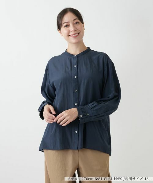 軽やかな薄手素材で仕立てた、スタンドカラーの前開きブラウス。落ち着きのあるカラーが、大人の装いに知的で洗練された印象を与えます。袖口とバックにはピンタックを入れアクセントをプラス。ゆったりとしたシルエットとドロップショルダーで、リラックス感がありながらも上品な雰囲気をキープします。パンツと合わせてシャープに、スカートと合わせてフェミニンにも。ウォッシャブル仕様でお手入れが簡単なため、日常使いからお出かけまで幅広く活躍します。
