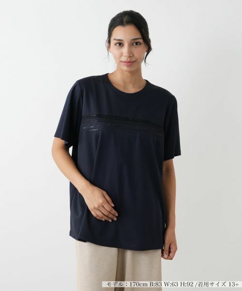 胸元にあしらったメタリックアンティークコードとスパンコールによる刺繍が、ラグジュアリー感を演出するカットソー。動くたびにさりげなく煌めき、コーディネートを格上げします。身体のラインを拾いすぎない、優雅なフレアシルエットもポイント。気になる部分を自然にカバーし、女性らしい柔らかなラインを描きます。伸縮性に富んだ薄手で滑らかな生地を使用。リラックスした着心地で、秋口の一枚着からジャケットのインナーまでロングシーズン活躍します。