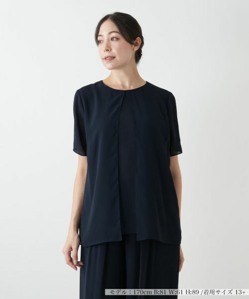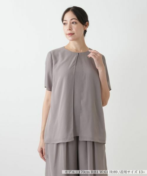 レイヤード風のフロントがエレガントな表情を演出するフレアブラウス。風をはらんで揺れる軽やかな素材感で、女性らしい優雅さを引き立てます。気になるお腹周りを自然にカバーしてくれる、ふんわりとしたシルエットも魅力。無駄な装飾を省いたミニマルなデザインでコーディネートしやすく、一枚で様になるのはもちろん、同素材のパンツと合わせればワンピース見えするセットアップスタイルも楽しめます。背中のループボタンにより開閉が可能。