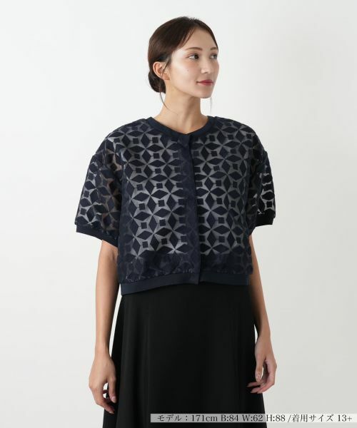 モダンな幾何学柄が浮かび上がる、シアー素材のショートジャケット。上品な透け感がコーディネートに軽やかさと、女性らしい抜け感をプラスします。コンパクトなショート丈で、ワンピースやフレアスカートとも相性抜群。カーディガンよりもきちんと感があり、季節の変わり目の羽織りとして重宝します。いつもの装いにプラスするだけで、ぐっとトレンドライクな着こなしが完成する一枚。