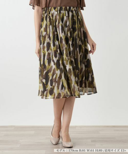 まるで抽象絵画のようなペイント柄のプリントが、秋のスタイリングをモダンに彩るフレアスカート。軽やかな生地が優雅な揺れ感を演出。ウエストはゴム仕様で、穿き心地はストレスフリー。落ち着いた秋色プリントなので、シンプルなニットを合わせるだけでぐっとこなれた印象に仕上がります。コーディネートの主役になる、存在感溢れる一枚です。