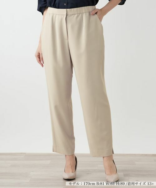 ウエスト回りはゆったり、裾に向かって細くなる絶妙なテーパードシルエットがこなれたムードを演出するパンツ。裾のスリットが足元に軽やかな抜け感をプラスします。後ろウエストはゴム仕様でリラックスした穿き心地ながら、前から見るとすっきり上品な印象に。気になる下半身を自然にカバーしつつ、美しいレッグラインを叶えます。オンオフ問わず活躍し、日々の着こなしを格上げしてくれる一本です。