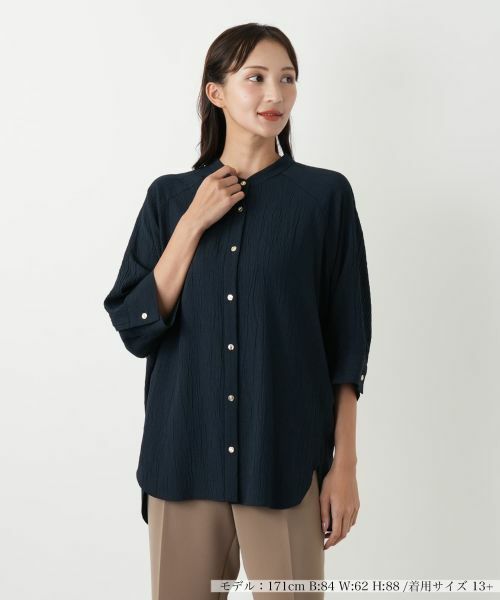 ナチュラルなシワ加工が、こなれた表情を演出するドルマンスリーブブラウス。肩周りが楽なドルマンスリーブとストレッチの効いた生地で、リラックスした着心地を叶えます。身体のラインを拾いにくいゆったりとしたシルエットで、気になる体型もさりげなくカバー。シックな色合いでコーディネートを気にせず着られる手軽さも魅力です。一枚で着るのはもちろん、前のボタンを開けて季節の変わり目の軽い羽織りとしても活躍する、着回し力の高いアイテムです。