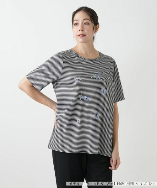 定番のボーダーTシャツに、遊び心溢れる刺繍を散りばめた大人可愛い一枚。チャーミングなモチーフの刺繍と、キラリと光るラインストーンが、カジュアルな中にさりげない華やかさをプラスします。肌触りの良いコットン素材と伸縮性のある生地で着心地も快適。程よくゆとりのあるシルエットで、気負わずデイリーに着こなせます。いつものボトムスに合わせるだけで、コーディネートがぐっと楽しくなるトップスです。
