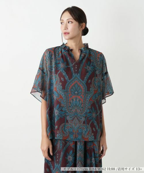 ヴィンテージライクなペイズリー柄のプリントが、秋のムードを高めてくれる華やかなスキッパーブラウス。顔周りを彩るフリルとすっきりと開いたネックが、甘さと抜け感の絶妙なバランスを生み出します。さらに軽やかなシアー素材も女性らしい柔らかな雰囲気を後押し。同素材のスカートと合わせれば、ワンピース見えするエレガントなセットアップも楽しめます。一枚で着こなしがぱっと華やぐ、主役級のトップスです。