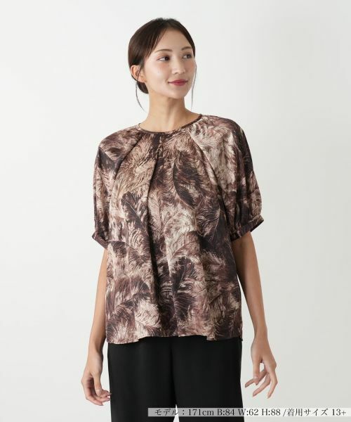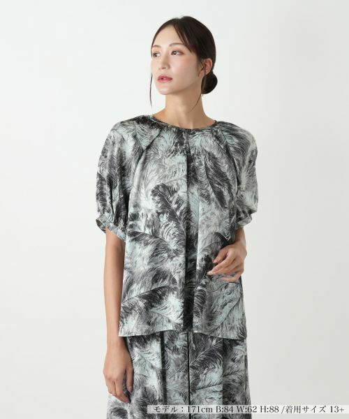 一枚の絵画を纏うように、ドラマティックなフェザー柄が華やかなブラウス。肩のラインを気にせず着られるラグランスリーブと、ふんわりとしたパフスリーブが女性らしい柔らかな雰囲気を演出します。同素材のスカートと合わせれば、ワンピース見えする格調高いセットアップスタイルが完成します。秋の装いをエレガントに彩る、主役級のトップスです。