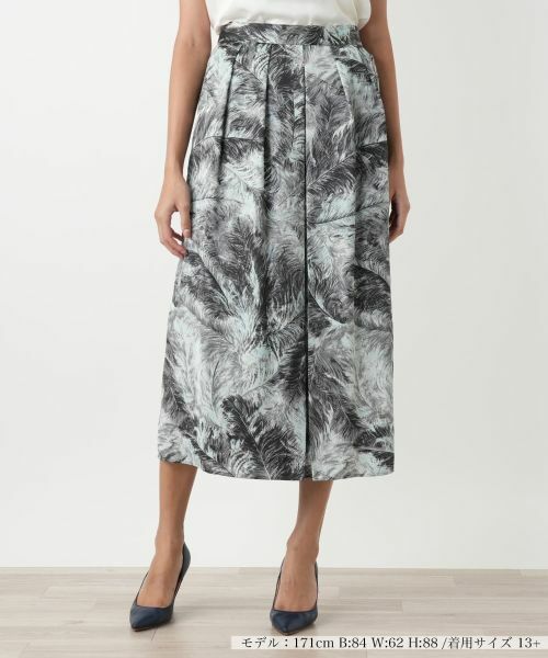 繊細なフェザーをモチーフにした、ドラマティックなプリントが目を惹くフレアスカート。ウエストのタックにより歩くたびに優雅に揺れ、華やかなAラインシルエットを描き出します。後ろウエストはゴム仕様で、リラックスした穿き心地ながら、前から見るとすっきりとした印象に。同素材のトップスと合わせれば、より洗練されたセットアップスタイルも楽しめます。秋のコーディネートの主役になる、存在感抜群のアイテムです。