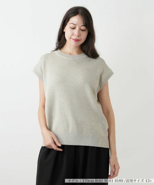 コーディネートにさりげない華やかさをプラスする、繊細なラメを編み込んだフレンチスリーブニット。首元をすっきりと見せるクルーネックラインが、落ち着いた上品なムードを演出します。肩先をきれいにカバーするフレンチスリーブも涼やかで女性らしいポイント。一枚で着るのはもちろん、ジャケットなどのインナーとしても袖がもたつかず、シンプルに着こなせる着回し力抜群のアイテムです。