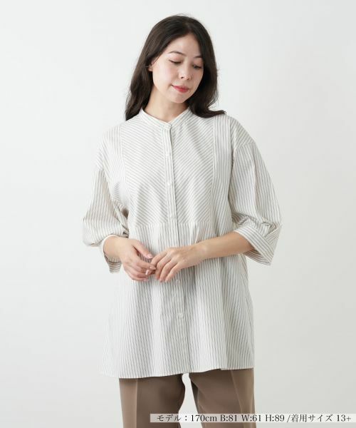 胸元のボザム切り替えに、さりげないこだわりが光るストライプ柄のバンドカラーブラウス。ボザム部分の生地をバイアス使いにすることで、ストライプ柄に動きを出し、表情にさりげなく変化を生み出しています。高めの位置で切り替えたウエストからふんわりと広がるシルエットが、ウエスト回りをナチュラルにカバー。伸縮性のあるコットンナイロン素材で着心地も良く、一枚で着映えする秋の主役級トップスです。
