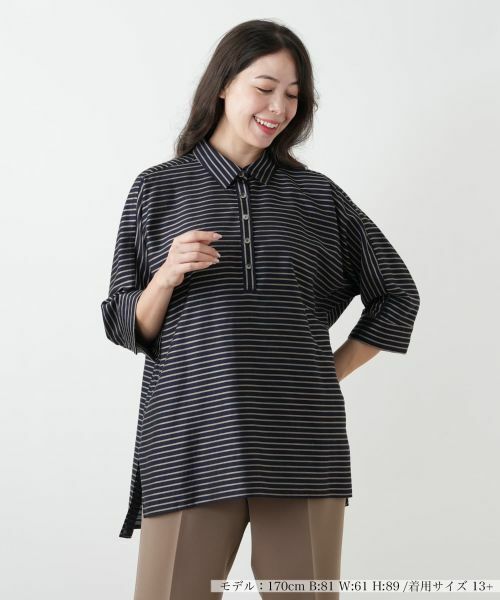 リズミカルなストライプの縁にさりげなくラメ糸を施した、上品な光沢感が魅力のブラウス。さりげないラメ使いが、シンプルながらも洗練された印象を与えてくれます。ベーシックなシャツカラーと、すっきりとしたシルエットで着回し力の高いアイテムです。程よい透け感のある軽やかな素材がと裾サイドのスリットが大人の抜け感を演出。オフィススタイルにはもちろん、カジュアルなボトムスと合わせたデイリーユースにも活躍。