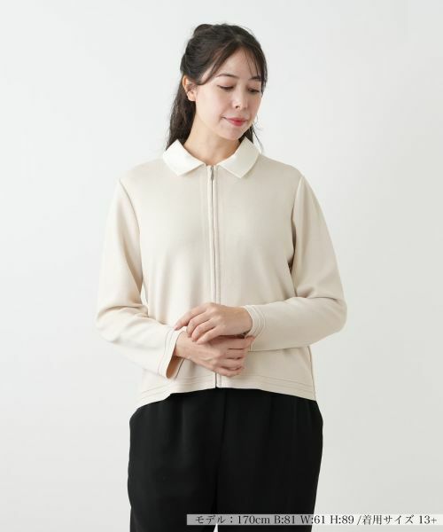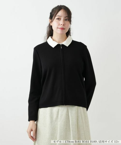 きちんと感とカーディガンのような軽やかさを両立した、2WAY仕様のジャケット。襟は取り外し可能となっており、付ければクラシカルな印象に、外せばミニマルなノーカラージャケットとしてシーンに合わせて楽しめます。伸縮性のある快適な着心地で、袖口や裾にあしらわれた繊細なピンタックが上品なアクセントに。フロントはジップアップで着脱もスムーズ。様々なボトムスとバランスの取りやすい、洗練された大人の羽織りアイテムです。