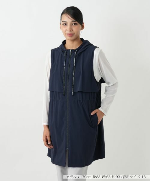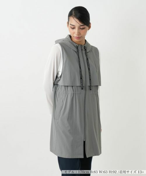 さっと羽織るだけで旬のスポーティMIXスタイルが完成する、フード付きロングベスト。立体感を生むレイヤード風のデザインや、フード紐のロゴが着こなしのアクセントに。伸縮性のあるやや薄手の生地使いで、軽やかな着心地もポイント。ヒップが隠れる長めの着丈が縦のラインを演出し、すっきりとした印象に見せてくれます。ウエストのドローコードをきゅっと絞れば、メリハリのあるシルエットへのアレンジも可能。