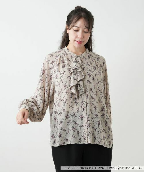 胸元を飾るラッフルフリルのボウタイがクラシカルなムードを演出するブラウス。繊細なタッチで描かれた小花柄と軽やかな素材感が、ヴィンテージライクな上品さを引き立てます。フロントはすっきりとした比翼仕立てで、フリルの存在感が際立つデザインに。ジャケットのインナーとしても活躍し、同素材のスカートと合わせれば、ワンピース風のセットアップスタイルもお楽しみいただけます。