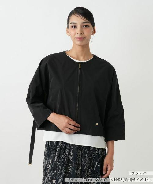 カーディガン感覚で気軽に羽織れる、スポーティーかつフェミニンなノーカラージャケット。フロントジップのすっきりとしたミニマルなデザインながら、バックスタイルはウエストのシャーリングギャザーでふんわりとさせたバックコンシャスな一枚。やや伸縮性のある軽やかな生地感なので着心地も快適。ワンピースとのレイヤードやハイウエストボトムスとも相性抜群のアイテムです。