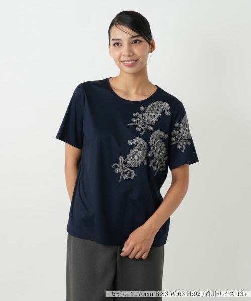 流れるようなペイズリー柄を、繊細な刺繍で表現した上品な佇まいのカットソー。コットンブレンドの滑らかな生地は、肌当たりも優しく快適な着心地に。シンプルなTシャツデザインながら、アシンメトリーにあしらわれた刺繍が顔周りを華やかな印象に。一枚で着るのはもちろん、ジャケットやカーディガンのインナーとして刺繍を覗かせれば、秋のコーディネートをクラスアップしてくれます。