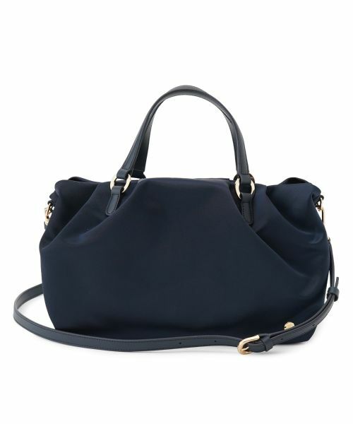 上品な光沢感のナイロンに、牛革とゴールドパーツを合わせたエレガントなハンドバッグ。絶妙なタックデザインが、ふんわりと柔らかな女性らしいフォルムを生み出します。荷物をすっきりと整理できる構造で収納スペースも備え、中央はファスナー付きで安心して収納可能。軽量で持ちやすく、付属のストラップを装着すればショルダーバッグとしても活躍。オンオフ問わず、毎日のコーディネートに寄り添うアイテムです。
