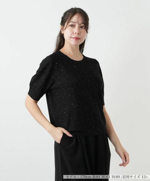 スパンコールを撚り合わせた糸で編み立てた、繊細な輝きが魅力のクルーネックニット。滑らかな肌触りのレーヨンブレンド素材は着心地も快適。程よくボディにフィットするすっきりとしたシルエットが、女性らしいラインを引き立てます。一枚で着て様になるのはもちろん、ジャケットやカーディガンのインナーとして、胸元にさりげない華やかさをプラスするのにもおすすめ。秋のコーディネートを格上げしてくれるトップスです。