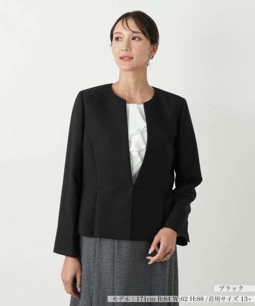 ライトオケージョンシーンにもおすすめの上品なジャケットです。無地のシンプルなデザインは、どんなインナーやボトムスとも合わせやすく、着回し力に優れています。長袖で、季節を問わず様々なシーンで活躍します。美しいシルエットが、着る人の品格を引き立て、洗練された印象を与えます。ご自宅で手洗いができる仕様のため、汚れを気にせず気軽にご着用いただけます。ビジネスシーンはもちろん、お食事会やちょっとしたお集まりにも最適な一着です。