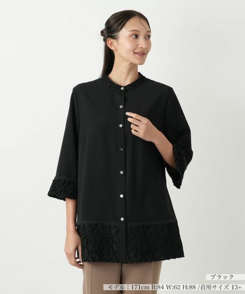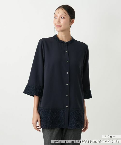 上品な無地ライクの羽織ブラウスです。スタンドカラーがきちんと感を演出しますが、ゆとりのあるシルエットでリラックスして着用いただけます。七分袖ですので、軽やかに羽織ることができ、季節の変わり目や冷房対策にも活躍します。繊細なレース使いがアクセントとなり、羽織るだけでエレガントな印象をプラスします。ブラウスとしてはもちろん、ライトアウターとしても楽しめる汎用性の高い一枚です。ご自宅で手洗いができるウォッシャブル仕様で、お手入れも簡単に行えます。