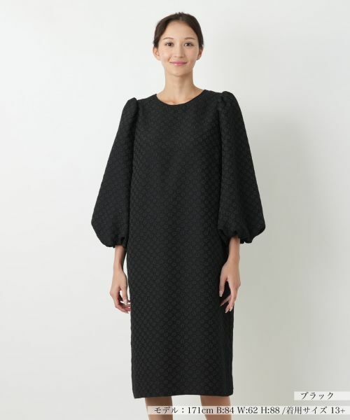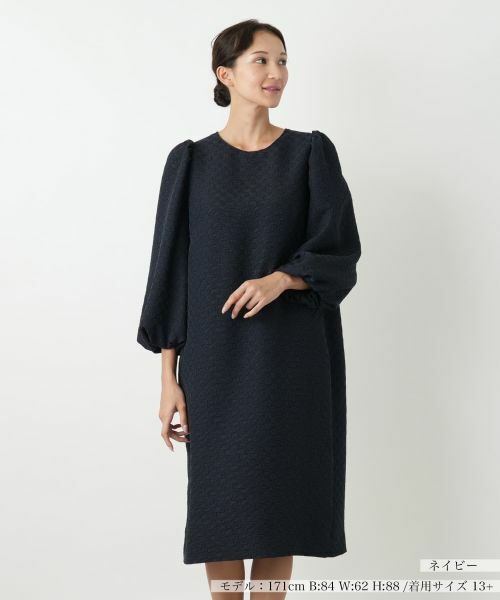 立体的な織り柄が特徴のワンピースは、シンプルながらも表情豊かなデザインが魅力です。上品な素材感が、シックな装いを演出します。丸みのあるラウンドネックと、ボリュームのあるバルーンスリーブが、女性らしい柔らかなシルエットを作り出します。すとんとしたIラインのシルエットは、体型を拾いすぎずにすっきりと見せ、着丈は膝下で上品な印象を与えます。アクセサリーや小物使いで、オケージョンシーンから普段使いまで幅広く対応する、着回し力の高い一枚です。