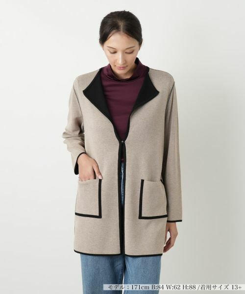 ------------------------------------着用シーズン:秋伸縮性:あり透け感:なしポケット:あり生地の厚さ:やや厚手-------------------------------------リバーシブル ダブルフェイス カーディガンリバーシブルで着用できる、ダブルフェイスのカーディガンです。長袖のデザインは、秋のコーディネートに活躍します。ノーカラーデザインが、すっきりとした印象。一枚羽織るだけで、上品なスタイルが完成します。※商品の色味は、撮影場所や光のあたり具合、お客様のお使いの機器により色味が違って見える場合がございます。予めご了承ください。家庭洗濯不可漂白不可タンブル乾燥不可アイロン低温160℃まで石油系溶剤ドライクリーニング弱ウェットクリーニング不可