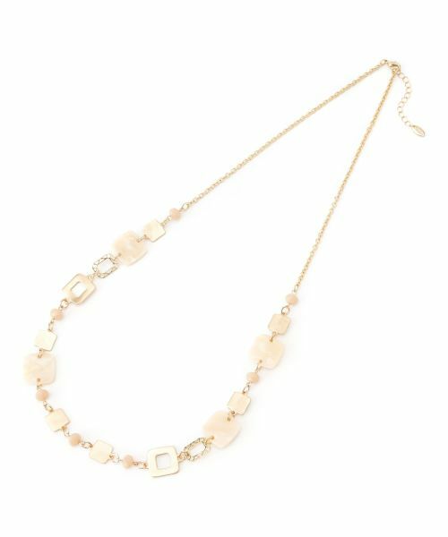 このロングネックレスは、大小様々なスクエアモチーフと小さなビーズがリズミカルに配置されたデザインが特徴です。つややかなモチーフと、マットな質感のモチーフが交互に連なり、光の反射で表情が変わる豊かな質感を楽しめます。シンプルなトップスに合わせるだけで、胸元に華やかさと奥行きをプラス。アジャスター付きで長さの調節が可能なので、コーディネートに合わせて様々なスタイルで着用いただけます。
