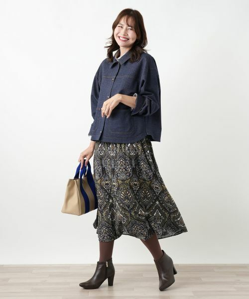 フランスDEVEAUX社の上質な生地に、洗練されたプリントを施したスカートです。セットアップ対応も可能で、上品な着こなしを演出します。ウエストゴム仕様で快適な履き心地も魅力です。