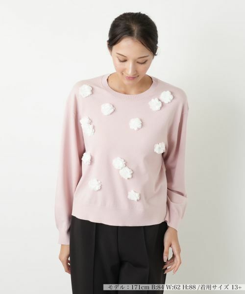 全面に散りばめられた立体的なフラワーモチーフが華やかなニットプルオーバーです。クルーネックのシンプルなデザインに、遊び心のあるモチーフが映え、一枚でコーディネートの主役になります。なめらかなニット素材で着心地も良く、カジュアルながらも上品な印象を与えます。スカートやパンツ、どんなボトムスとも相性が良く、日常使いからちょっとしたお出かけまで、幅広いシーンで活躍します。