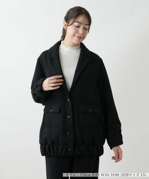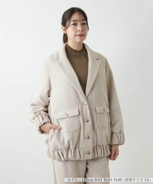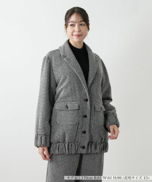 千鳥格子柄がクラシックで上品なジャケットです。襟付きのデザインがきちんとした印象を与えつつ、裾と袖口にあしらわれたシャーリングが、柔らかなシルエットと女性らしい雰囲気をプラスしています。フロントボタンで開閉でき、両胸のフラップポケットもデザインのアクセントになっています。厚手の素材感は、肌寒い季節の羽織りとして活躍し、同素材のボトムスと合わせれば、洗練されたセットアップスタイルが楽しめます。