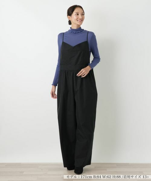 細い肩紐と、胸元のV字の切り替えが特徴的なサロペットパンツです。マットな質感の素材が、カジュアルすぎず上品な印象を与えます。ウエスト部分にはゴムが入っており、リラックスした着心地でありながら、ゆったりとしたワイドシルエットがトレンド感を演出。体型をカバーしつつ、女性らしい柔らかな雰囲気をプラスします。インナー次第で様々な表情が楽しめる、着回し力の高い一枚です。