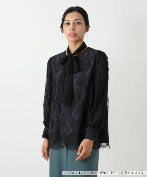 花の細かな部分まで繊細に表現されたリバーレースが美しい、ノーカラーブラウス。緻密なレースの奥行きが、上品で華やかな印象を与えます。身頃のレースは、淡いグレーの裏地を当てることで柄の美しさを際立たせ、袖には透け感を緩和し補強するチュール素材を使用するなど、細部にまでこだわりが光ります。同素材のタイが付属しており、様々なアレンジをお楽しみいただけます。長袖ながらも軽やかな素材感で、秋の装いにふさわしい一枚です。着るだけで顔周りを華やかに彩り、特別な日のおしゃれはもちろん、普段の装いも格上げしてくれるブラウスです。