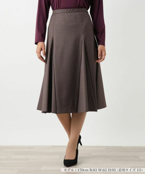 イタリア「REDA」社のスーパー110's原料を使用した、上質さと華やかさを兼ね備えたフレアスカート。濃淡の同系色で織りなされたメランジ素材は、奥行きのある柔らかな色合いが特徴で、派手すぎない上品な高級感を演出します。程よいストレッチ性があり、快適な履き心地ながらも、美しいフレアシルエットをキープ。ビジネスシーンからパーティーまで、幅広い場面でお使いいただける洗練された一枚です。同シリーズのブレザーやワンピース、パンツと合わせれば、統一感のあるスーツスタイルが完成します。ウエストはゴム仕様で、見た目の美しさと快適さを両立した、大人の女性のためのエレガントなスカートです。