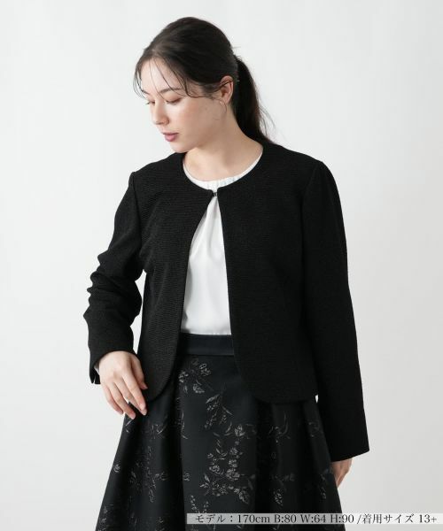 ------------------------------------着用シーズン:秋伸縮性:なし透け感:なしポケット:なし生地の厚さ:やや薄手裏地:あり-------------------------------------襟元はシンプルなラウンドネックで、フロントはホックで留めるデザインがすっきりとした印象を与えます。短めの着丈は、スカートやワンピースとの相性が良く、バランスの取れたスタイルを演出します。素材の凹凸感が、奥行きのある表情を生み出し、どんなシーンにも対応できるきちんと感を持ち合わせています。セレモニーシーンからビジネス、ちょっとしたお出かけまで、幅広い場面で活躍するエレガントな一枚です。※商品の色味は、撮影場所や光のあたり具合、お客様のお使いの機器により色味が違って見える場合がございます。予めご了承ください。家庭洗濯不可漂白不可タンブル乾燥不可アイロン低温120℃まですべての溶剤でドライクリーニング弱ウェットクリーニング不可