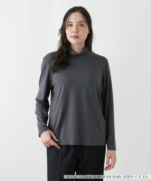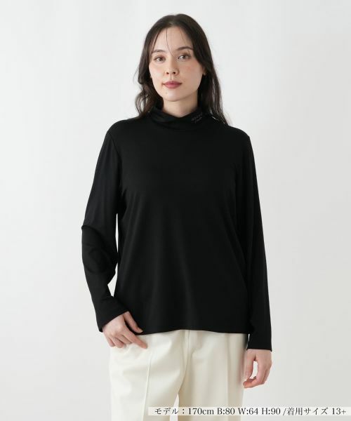 ハイネックにROCHAS Premiereのロゴ刺繍がさりげなく施された、長袖カットソー。シルケット加工を施すことで、シルクのような美しい艶と滑らかな表面感を実現いたしました。ソフトで柔らかく、優れた伸縮性も持ち合わせているため、快適な着心地をお楽しみいただけます。どんなトップスや羽織りのインナーとしても重宝し、幅広いコーディネートで活躍する便利な一枚です。ご自宅で手洗いできるウォッシャブル仕様なので、日常のお手入れも簡単。大人の女性のワードローブに上質さと快適さを添える、洗練されたインナーです。