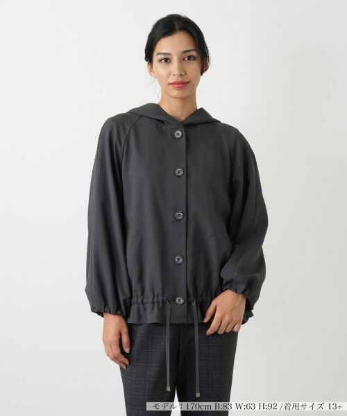 このフーデッドブルゾンは、シンプルなデザインながらも、ディテールにこだわりが光る一枚です。フード付きのカジュアルなデザインと、フロントに並んだボタンがアクセントに。ゆったりとしたラグランスリーブと、袖口にギャザーを寄せたふんわりとしたシルエットが、女性らしい柔らかな印象を与えます。裾にはドローストリングがあしらわれており、シルエットの変化を楽しめます。軽い羽織りとして季節の変わり目に重宝し、デイリーユースにぴったりのアイテムです。