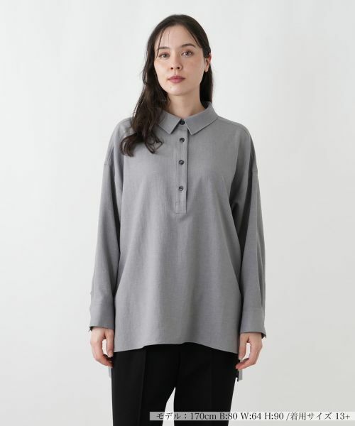 シンプルながらも洗練されたデザインのプルオーバーシャツです。襟付きのきちんと感と、ゆったりとしたシルエットが融合し、リラックスしながらも上品な着こなしを叶えます。比翼仕立てのフロントボタンがすっきりとした印象を与え、どんなボトムスとも相性抜群です。ドロップショルダーと長めの袖丈が、こなれ感を演出。カジュアルなデイリーユースから、オフィスシーンまで、幅広い場面で活躍する汎用性の高い一枚です。