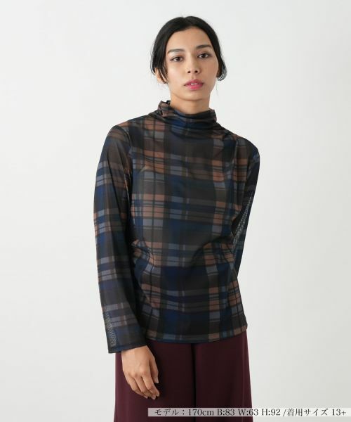 表情豊かなチェック柄のパワーネット素材を使用した、ハイネックカットソー。柔らかな肌触りと快適な着心地で、日常に心地よく溶け込みます。上品なハイネックは首元を優しく包み込み、これからの肌寒い季節にぴったりです。ご自宅で手洗いできるウォッシャブル仕様で、日常のお手入れも簡単。一枚で着ても、インナーとしても上品に映える、大人の女性のための着回し力の高いアイテムです。同シリーズのスカートと合わせれば、統一感のあるおしゃれなコーディネートが完成します。