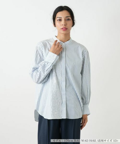 洗練されたストライプ柄が魅力の、スタンドカラーシャツブラウス。コットン100%の柔らかな肌触りが心地よく、日常に溶け込む快適な着心地です。襟元や前立てに施された繊細なレース使いが、上品な透け感とフェミニンな印象をプラス。長袖と品の良いスタンドカラーが、洗練された大人の女性の品格を演出いたします。ご自宅で手洗いできるウォッシャブル仕様で、日常のお手入れも簡単。一枚で着ても華やかな存在感を放ち、ジャケットやカーディガンのインナーとしても上品に映えます。秋の通勤スタイルから、ちょっとしたお集まりまで、幅広いシーンで活躍する一枚です。