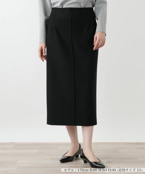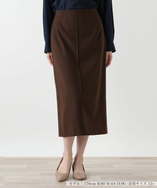素材感が際立つ、ミニマルなデザインのタイトスカートです。すとんとしたIラインシルエットが、ボディラインを美しく見せ、洗練された大人の雰囲気を演出します。フロントに施されたセンターシームが、縦のラインを強調し、脚長効果も期待できます。膝下丈で、オフィスシーンからフォーマルな場面まで幅広く対応。シンプルなトップスと合わせるだけで、品格のあるコーディネートが完成します。