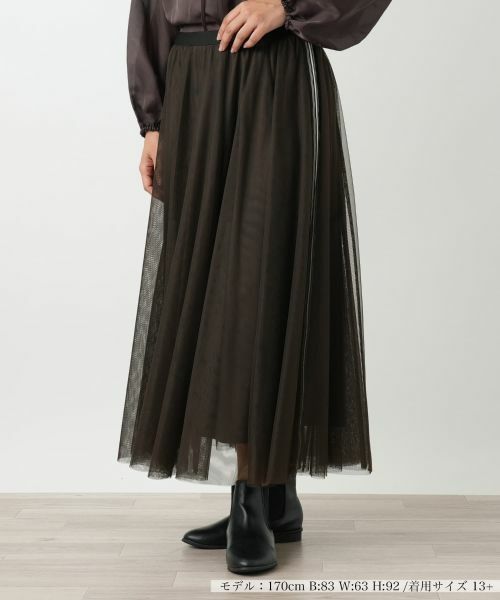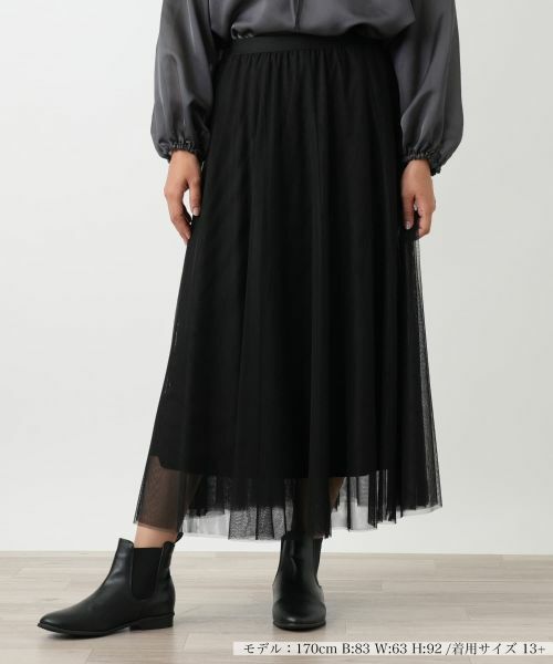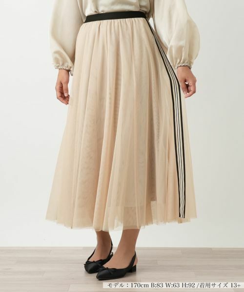 軽やかなチュール素材が何層にも重なった、ボリューム感のあるフレアスカートです。サイドに施されたラインデザインが、スポーティーなアクセントを加え、甘くなりすぎないモダンな印象を与えます。ウエストはゴム仕様で、快適な履き心地。歩くたびにふわりと揺れるチュールが、女性らしい優雅な雰囲気を演出します。カジュアルなトップスと合わせてデイリーに、きれいめなブラウスと合わせてお出かけにと、幅広いシーンで活躍する一枚です。