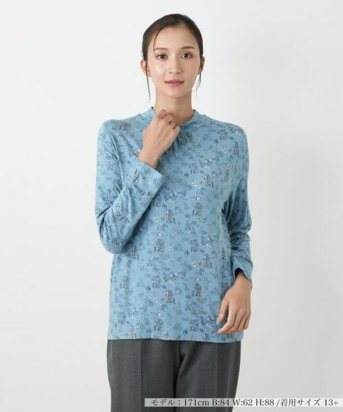 表情豊かなプリント柄が魅力の、ハイネックカットソー。レーヨンとポリウレタンをブレンドした素材は、柔らかな肌触りと快適なストレッチ性を兼ね備えています。程よい高さのハイネックは、首元を優しく包み込み、上品な印象を与えます。ご自宅で手洗いできるウォッシャブル仕様で、日常のお手入れも簡単。一枚で着ても、ジャケットやカーディガンのインナーとしても上品に映える、大人の女性のための着回し力の高いアイテムです。秋のコーディネートに軽やかなアクセントを添える、心地よさとデザイン性を兼ね備えた一枚です。